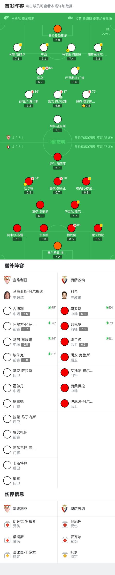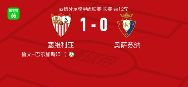 塞维利亚1-0奥萨苏纳,鲁文-巴尔加斯点射制胜